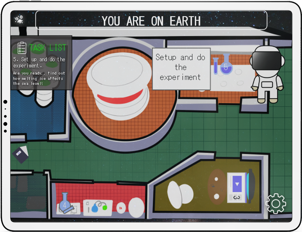 Inside the mini game — lab environment, task list panel, mascot moves around the space