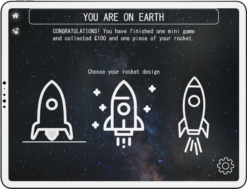 Rocket building — choose your rocket design after completing a mini game and earning £100