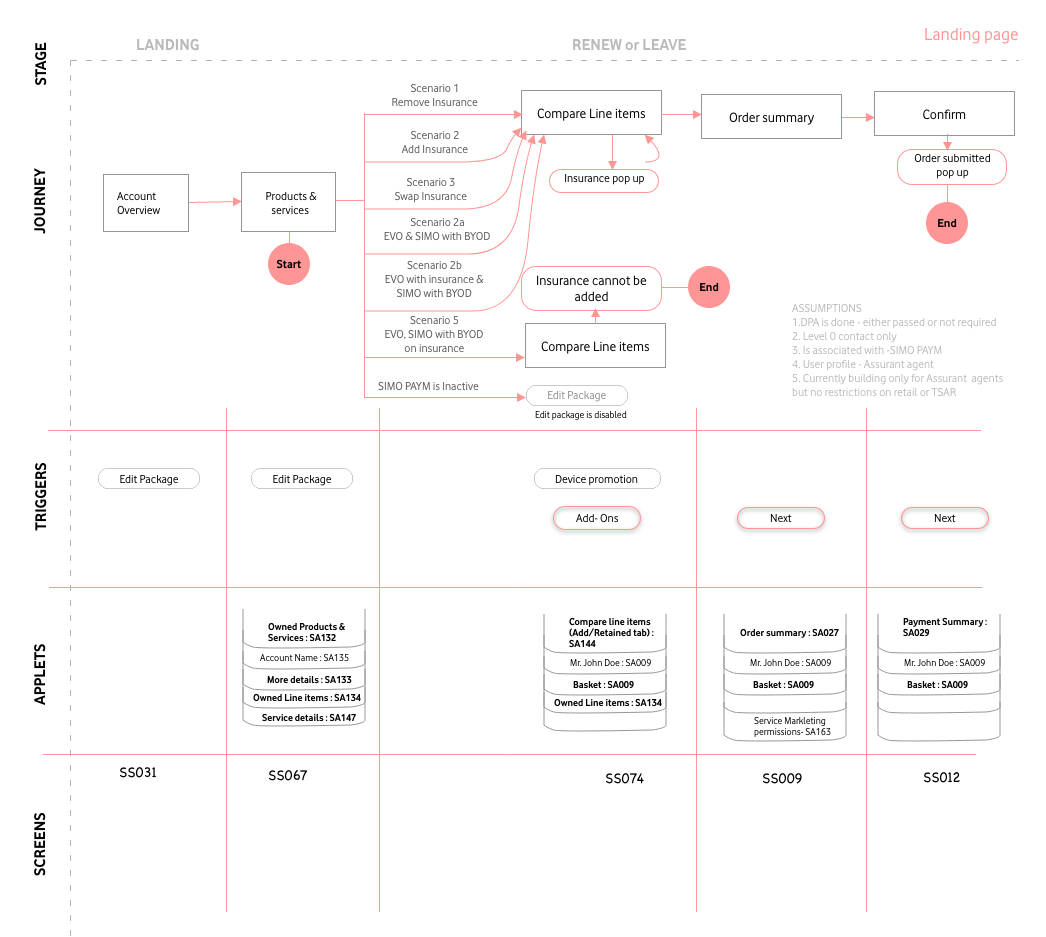 I started with a cross-functional workshop bringing together the Product Owner, Business Analyst, Propositions Lead, Solution Architect, and Tech Designer. Together we mapped the existing six customer journeys and identified where the insurance product would conceptually sit within each.